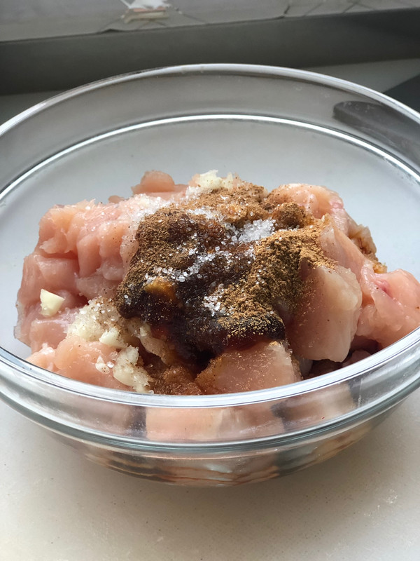 鸡胸肉切小块,大蒜切成蒜末,加入大蒜末、蚝油、十三香、五香粉、糖、生抽抓拌均匀。