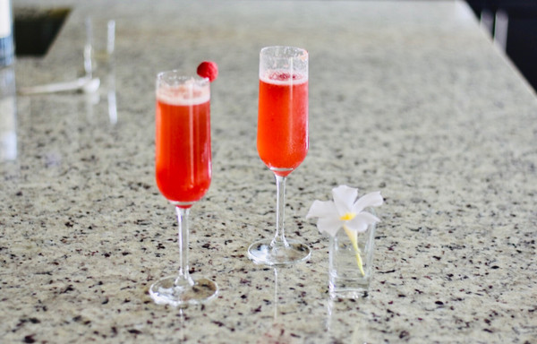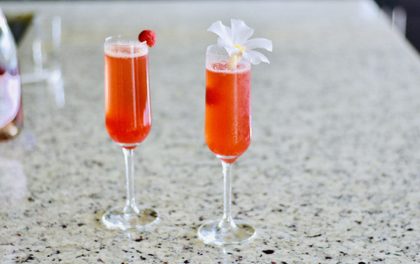 倒入粉红香槟酒,杯口插一颗树莓装饰