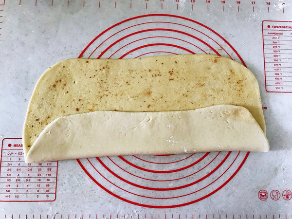 用擀面杖把面团擀开,尽量保持成长方形的形状。面不要擀得太薄,用刷子在上面刷一层薄油。