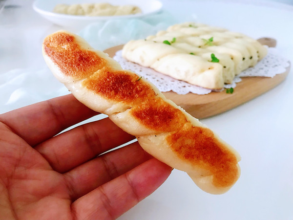 拿起一条,左右手捏住面条两头,稍稍拉长一些点点,拧成麻花形状。