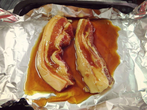 用叉烧酱、生抽、料酒、糖腌五花肉,放进冰箱一个晚上。烤的时候用锡纸完全包住,倒入剩余的汁,220度,30分钟。
