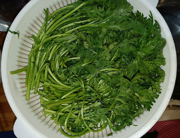 3.茼蒿捞出放凉或者过冷水挤出水分切小段,放入蒜末!放香油,盐,醋,食用油烧热浇入!
