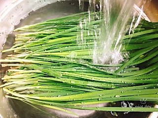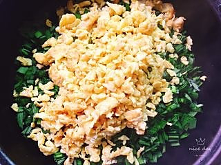 碗里放入切碎的韭菜末、倒入刚才炒制的鸡蛋碎,