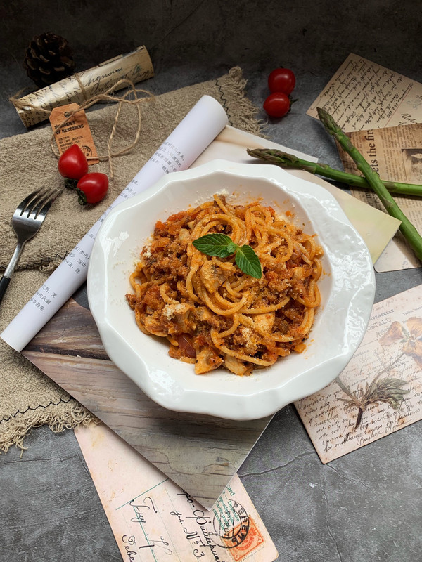 番茄炒出沙了,放入肉酱,倒入1勺红酒,炒出香味。