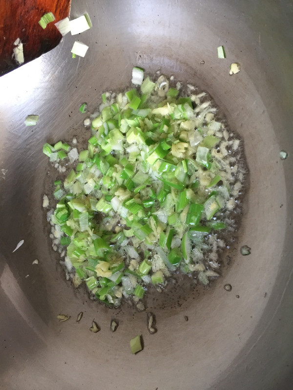 梅菜提前泡水洗净,肉馅放料酒及适量清水搅打,热锅加油,葱姜末爆香。