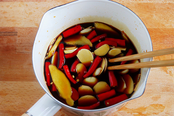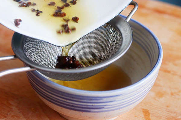 锅内加油,加入1勺花椒粒,小火炸香后沥出花椒油