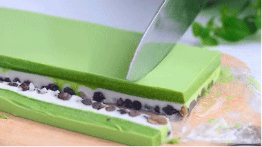 7.另一半加入抹茶粉搅匀,倒入凝固的原味小方中,冷藏。