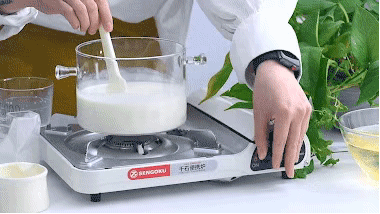 3.牛奶,淡奶油,椰浆和糖一起倒入锅中小火搅拌至糖融化 注意点:一定要小火搅匀,不然会翻滚糊底