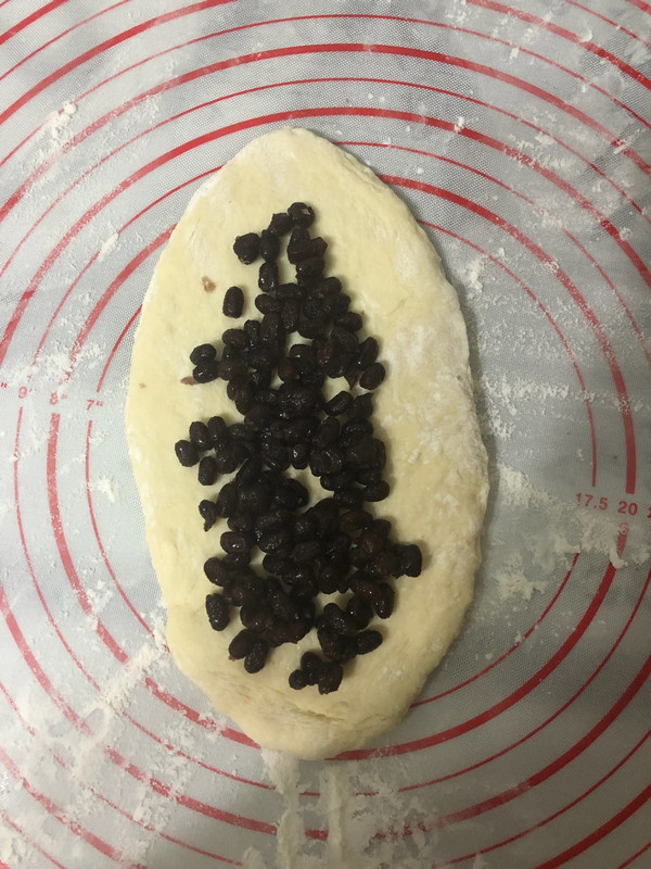 20分钟后取一个面团,轻轻擀成牛舌形,放上蜜红豆后,卷起来。