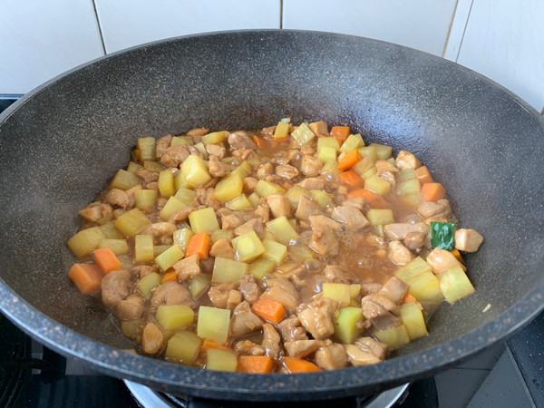放入胡萝卜和土豆,翻炒均匀,倒入2小碗的水,炖煮5分钟左右。