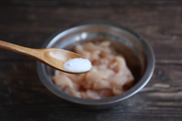 将去皮鸡腿肉放在一个较大的容器里,放入1g的盐。