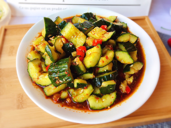 腌制的黄瓜倒出水份,倒入调好的酱汁,搅拌均匀即可