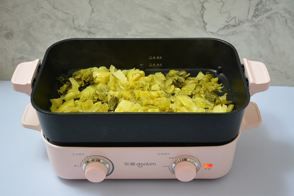 锅中倒入适量的菜籽油,待油熟烫之后下入酸菜翻炒出香味,起锅装碗待用。