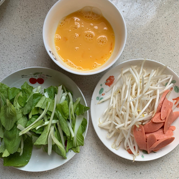 豆芽、青菜洗净、火腿肠切片、鸡蛋打散。
