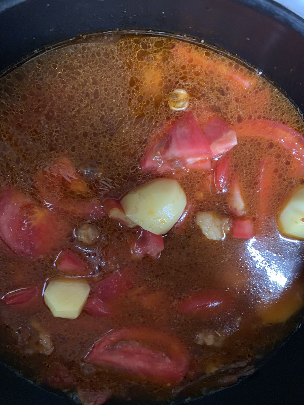 高压锅排完气,把牛肉倒入炖锅中。放入土豆块和番茄,小火慢炖20分钟