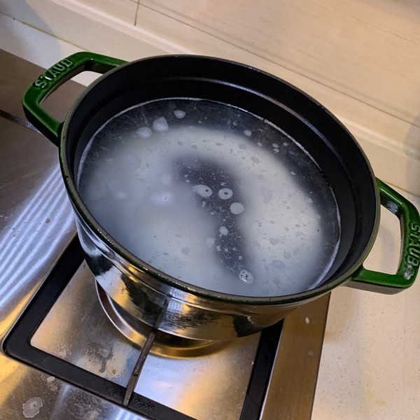 生米放入锅中开熬,因为早上时间赶,米是前一天晚上先洗好,冷冻在冰箱里,早上拿出来生滚,这样煮的快~