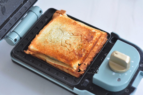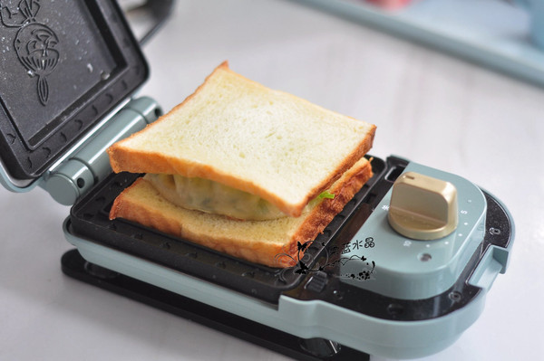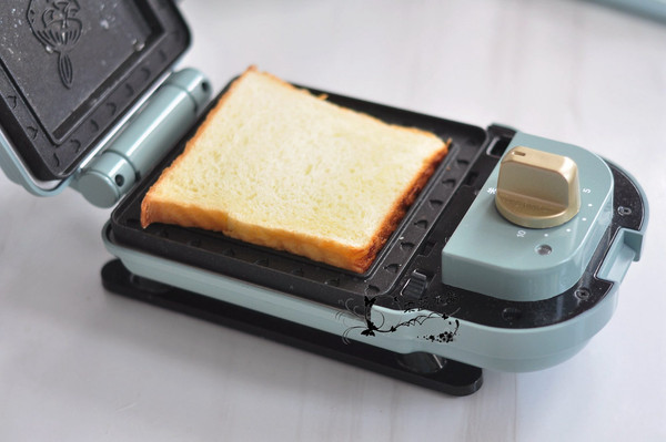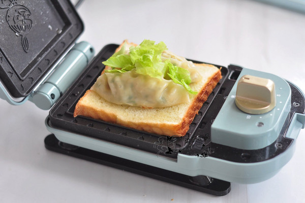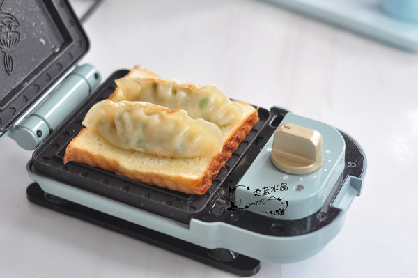 将冷冻的煎饺从冰箱取出,直接放在三明治机上加热2分钟,盖子虚掩就行,不用锁紧卡扣。