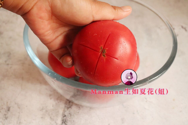 备一壶开水,开水从顶部浇下去,最好能把番茄都浸泡在开水里,静置一两分钟就就能看到番茄皮有些脱落了,把番茄取出来,把番茄皮剥掉。
