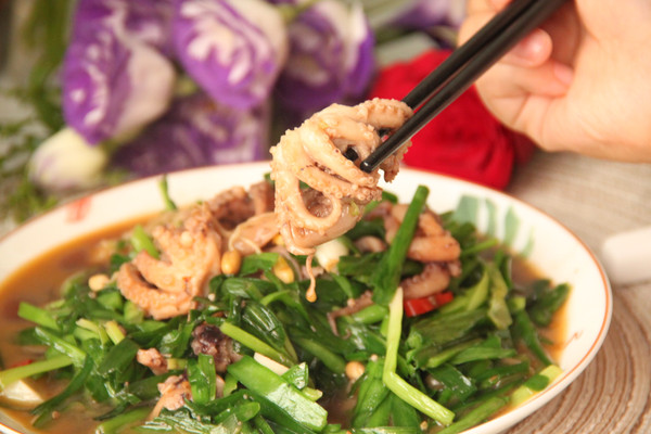 放入小章鱼翻炒几下,因为是即食的,稍微加热一下就行。