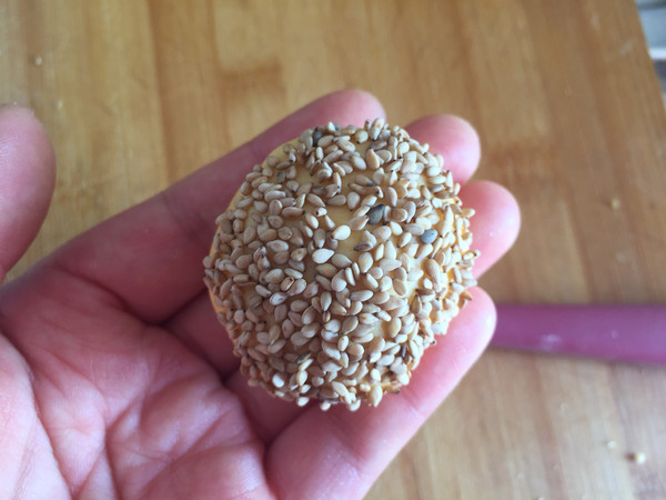 每个小面团的一面沾上白芝麻