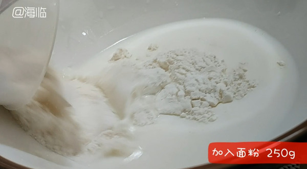 取一只空碗,200ml纯牛奶,加250克普通面粉。搅拌均匀。