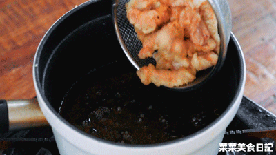 然后等油温升至190度,下里脊条复炸30秒,炸至金黄香脆,捞起沥干待用