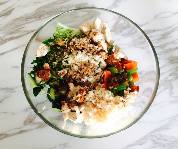 将糙米、鸡胸肉和其他材料放在一个碗里,倒上油醋汁拌匀即可