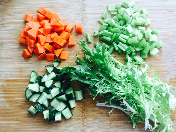 将苦苣洗净,胡萝卜、黄瓜、芹菜切丁