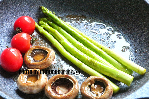 牛排煎好后,放在温热的盘中静置,让肉汁回到肌肉组织中,这一步静置可以让煎出的牛排纤维松弛,因而牢牢地锁住肉汁。锅中还剩的油不要倒,搭配牛排的蔬菜芦笋、圣女果、口蘑在锅里煎一下。