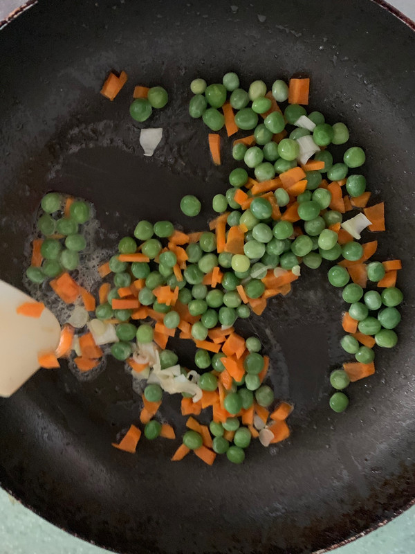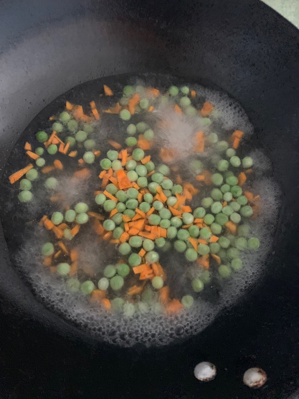 锅中留底油爆香葱花后下豌豆胡萝卜丁翻炒。