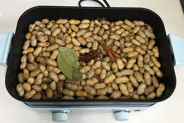 把花生倒入锅中,加入适量的清水,放上花椒、桂皮、香叶和八角。