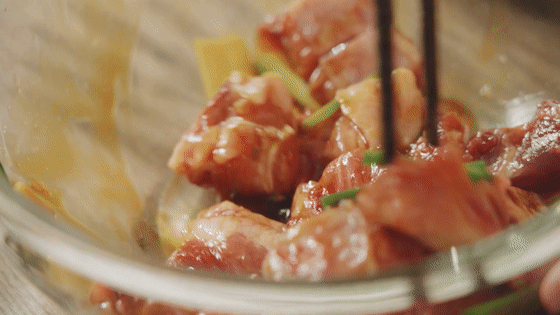 排骨剁小块,洗净。加入葱段、姜片、蚝油。