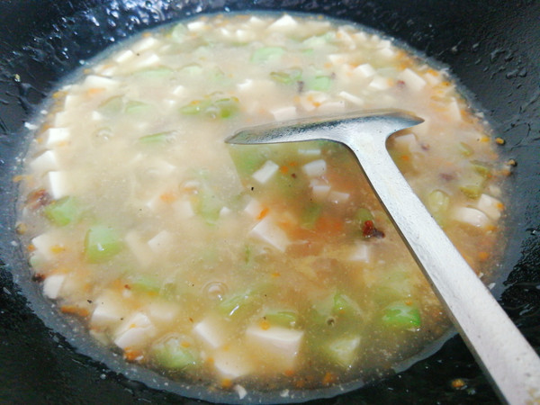 这道汤除了丝瓜,我还加入了内脂豆腐,可以让口感更爽滑,还有胡萝卜,可以让汤的颜色搭配更漂亮,口感更鲜美,另外,还加了一点手工腊肠,为了是提升整道汤的香味。它们不仅在色彩上互搭,营养上也互补,让整道菜的色泽,口感,营养都丰富起来。