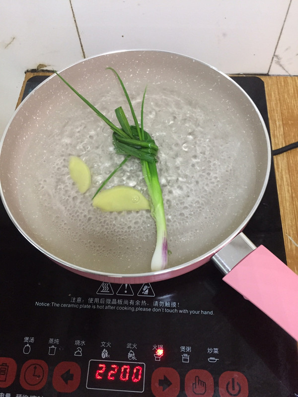 锅内煮开水后放姜片跟打结的香葱
