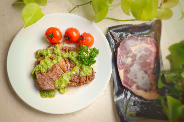 牛眼肉出炉后,静置2-3分钟,逆纹切片,淋上阿根廷风味辣酱即可。