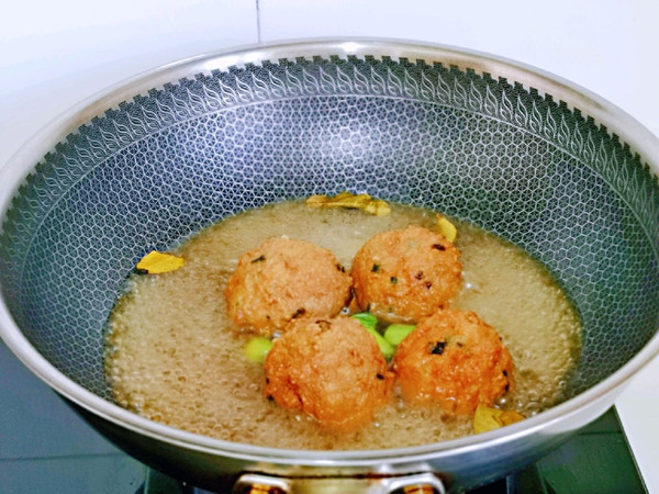 锅中加入纯净水,放入狮子头。(因为狮子头油炸锅,所以不用起油锅,直接加水即可)