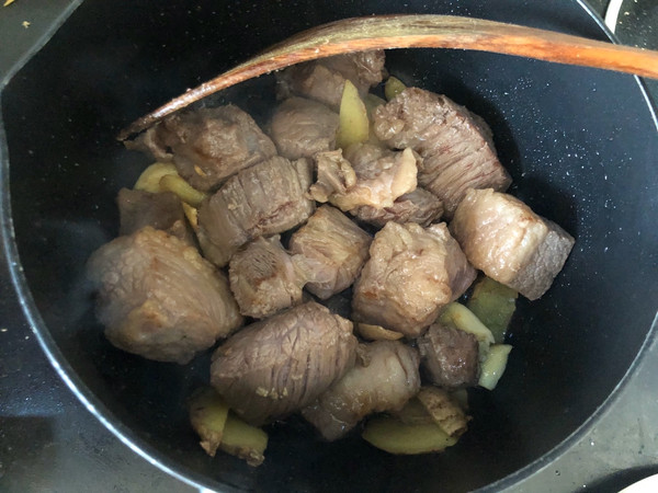 加入生抽、老抽、白糖,翻炒至牛腩上色均匀