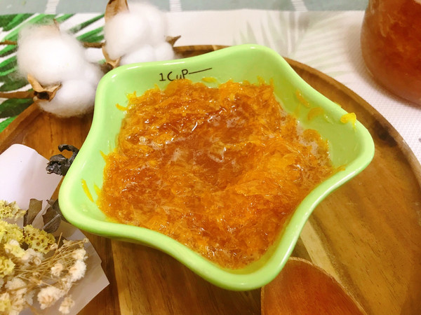柚子皮切成丝,冷水浸泡至少一小时,去除多余苦味。