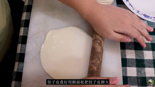 1.饺子皮表面抹油,在放上一张饺子皮,重复叠加5张饺子皮,用擀面杖把饺子皮擀大