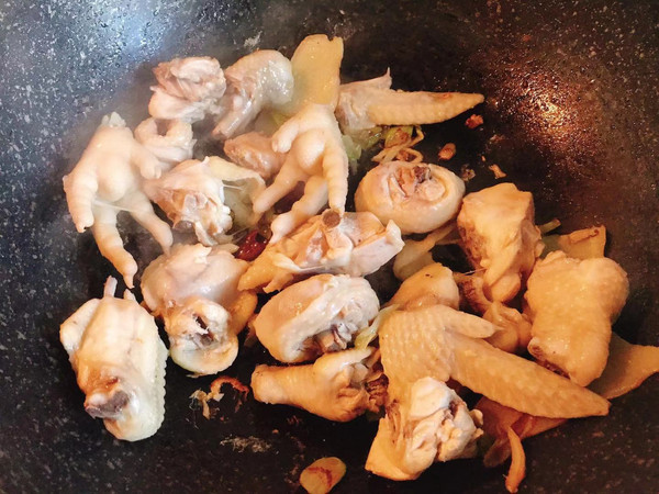 放入焯好的鸡肉,大火翻炒,炒出鸡皮中的油脂。