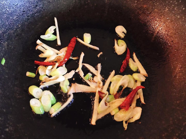 锅内放少许油,加入葱丝姜丝爆香,一定要用小火慢慢炒出香味,否则容易糊。