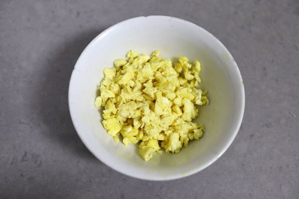 鸡蛋打散,平底锅中倒适量油,将鸡蛋液入锅不停搅拌,成细小而均匀的鸡蛋块;