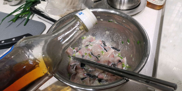 沥干 加入料酒,花椒,盐2小匙,去腥 浸泡20分钟 (我忘记买生姜了,应该再放几片姜)