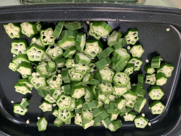 料理锅中加入适量食用油,加入秋葵翻炒至变成翠绿色
