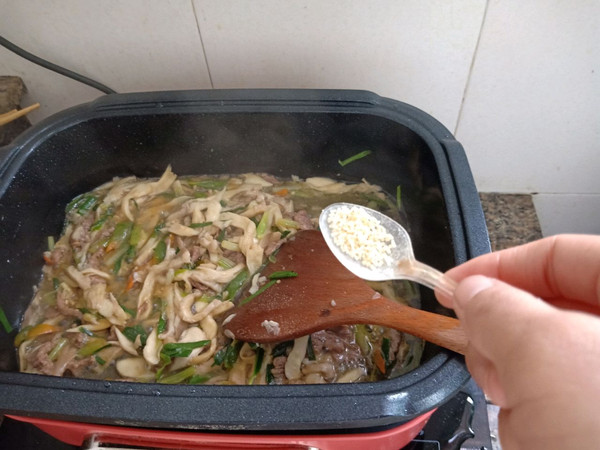 多功能锅预热好了放油烧热了放肉丝进去翻炒几下