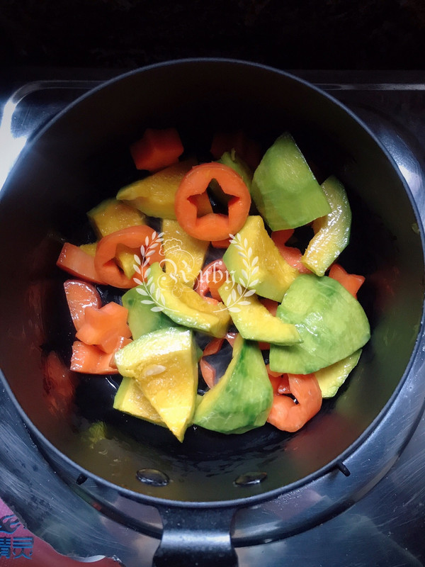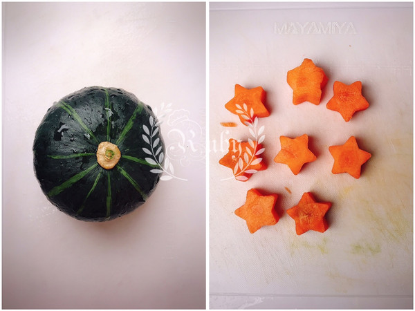 南瓜洗净去皮切小块;胡萝卜切几个花片,其余也不要扔掉,一会一起放进去炖