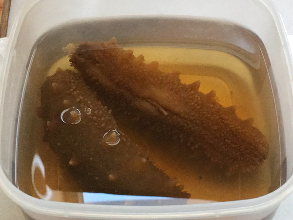 干海参,用冷水冲洗干净表层泥沙,加水入冰箱保鲜泡发,连续三天,每天都重复一次,第三天,清洗干净海参的内脏,彻底洗净,继续加水入冰箱,第四天,两浸泡海参的水一起炖煮二十分钟,晾凉后继续入冰箱,第五天再次炖煮三十分钟,再次入冰箱保鲜,第六天,将海参炖煮三十到四十分钟,这时,海参进本已经结束泡发,随时可以制作食用。