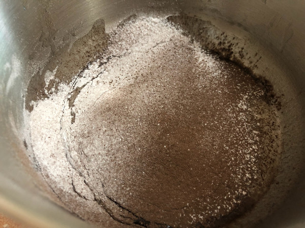 低筋面粉和可可粉过筛筛入油水中,用蛋抽切拌均匀;