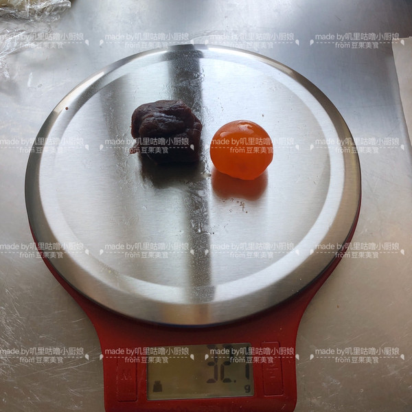 接下来处理内馅。取一个咸蛋黄上称,然后揪一坨豆沙,保证豆沙和一颗咸蛋黄一起重32g即可