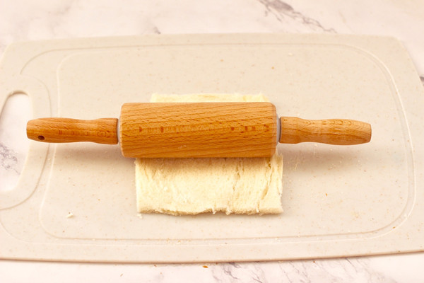 然后用擀面杖把吐司片擀的薄一些,这样做出来的吐司卷,口感更香酥好吃。